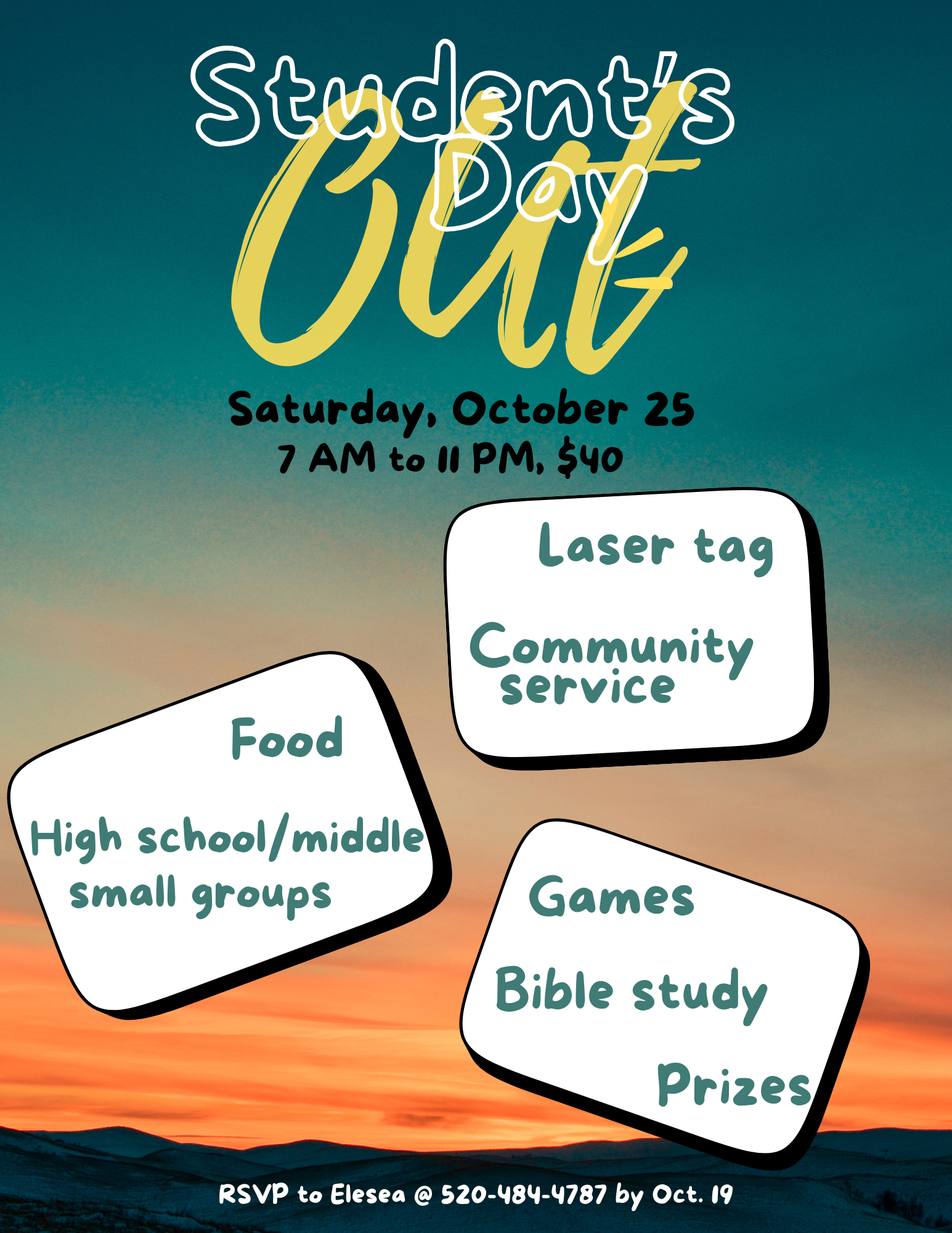 I am so looking forward to this day with your students. We start our day with a service project, then fill the rest of the day with Bible studies, fun outings, and lots of good food. We'll end the day with laser tage. $40.00 each. Hope to see everyone! - Elesea Russo